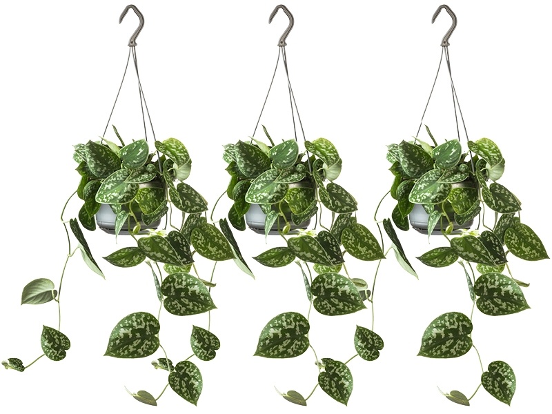 Donkergroene, hartvormige bladeren met leuke, haast lichtgevende zilverwitte vlekjes: dat is de Scindapsus pictus. De klimmer wordt ook wel zilverrank genoemd en komt oorspronkelijk voor in bosrijke gebieden in Zuidoost-Azië waar hij met luchtwortels in bomen groeit en in rap tempo vele meters hoog kan worden. Bij jou thuis of op kantoor kun je deze snelle groeier niet alleen als staande kamerplant tegen een stam of (mos)stok laten opklimmen, maar ook als hangplant ophangen of bijvoorbeeld op een kast zetten. Geniet van de lange uitlopers vol glanzende bladeren die losjes naar beneden groeien.